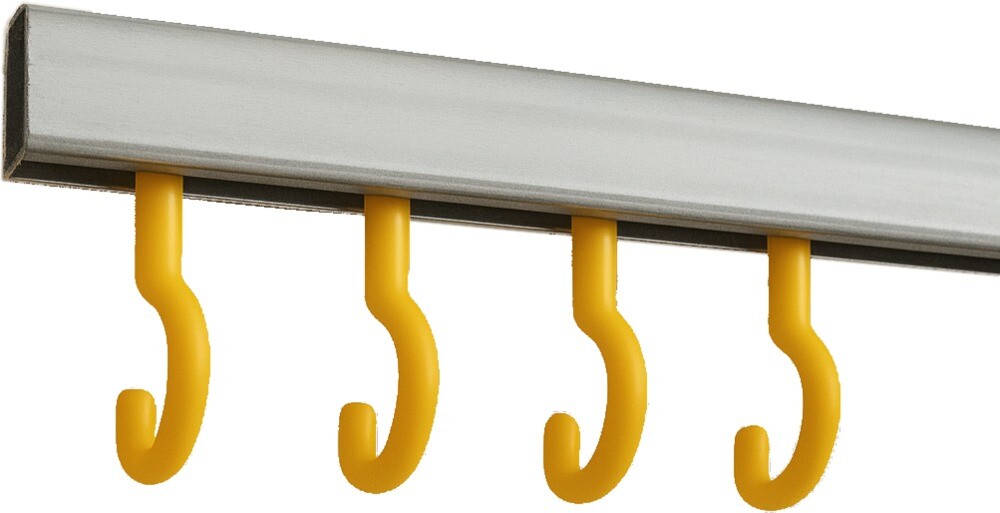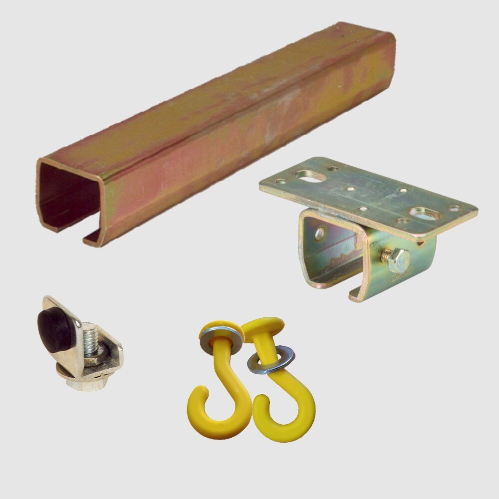 Set se skládá z ocelové pozinkované kolejničky velikosti 35x40 mm, 6 ks pozinkovaných upevňovacích (nosných) komponentů na strop, 2 ks dorazů a 37 ks plastových háčků s mosaznou podložkou. Podložky slouží ke snížení tření při přesouvání háčků v kolejničce. Váha setu je 16,5 kg.